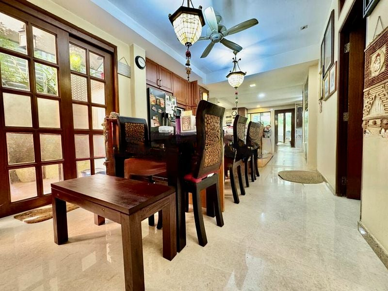 This spacious 4-bedroom, 4-bathroom home boasts an open-concept living area, enhanced by a stylish wooden slat room divider and a chic blue designer armchair that adds a pop of colour. The entrance foyer welcomes you with dark wood decking, complemented by a stunning abstract artwork and built-in white storage cabinets, setting the tone for the rest of the home. With a generous floor area of 4000 sqft, every corner of this residence exudes sophistication and comfort.