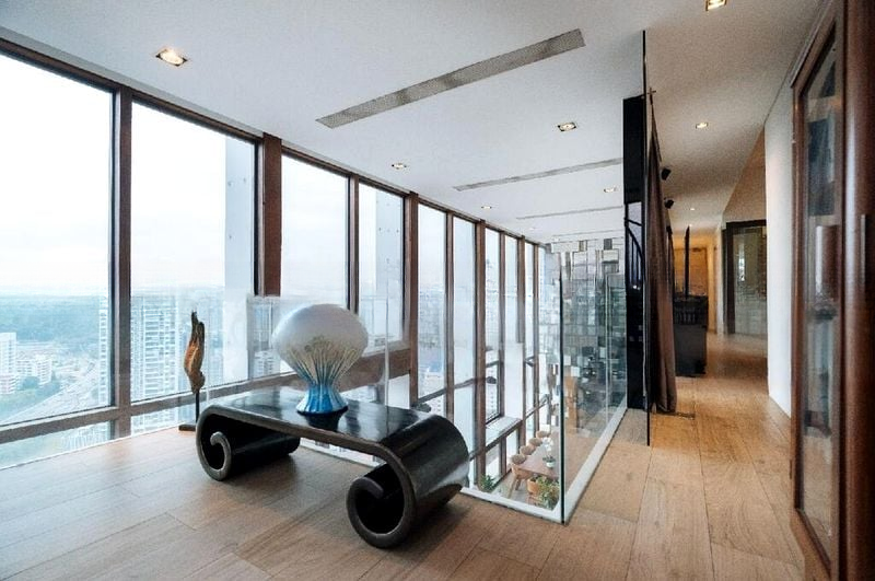 Step into a world of luxury as you enter this exquisite penthouse at 1 Moulmein Rise. The abundant natural light floods through the floor-to-ceiling windows, illuminating the double-volume living area adorned with elegant wooden flooring. The airy ambiance is complemented by breathtaking views of the city skyline, creating a serene yet vibrant atmosphere that invites relaxation and entertainment.