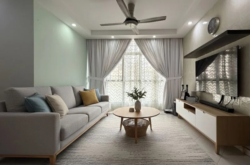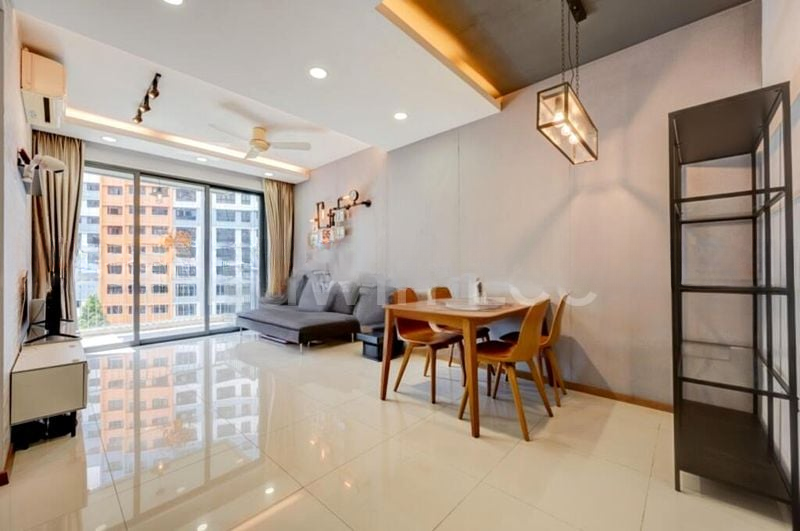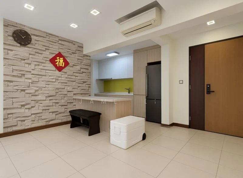 Step into a bright and airy sanctuary at Blossom Residences, where abundant natural light floods through floor-to-ceiling windows, illuminating the stylish brick-patterned feature wall in the living room. The open-concept layout creates a seamless flow between spaces, inviting you to relax or entertain in comfort while enjoying urban views and greenery from your windows.