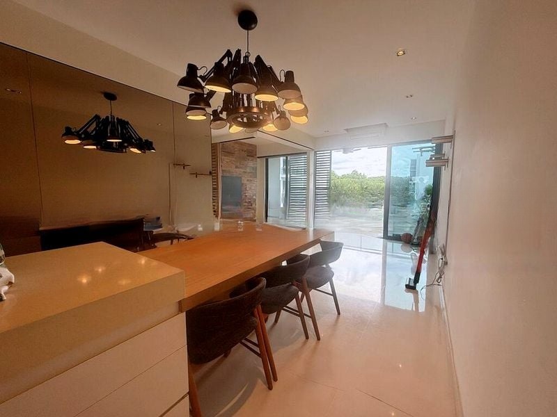 Step into a sanctuary of modern minimalist design, where abundant natural light floods the space, highlighting the polished tile flooring and the stunning designer multi-arm chandelier. The large balcony, adorned with wood decking, invites you to unwind while enjoying serene views of the pool and lush greenery, creating a perfect backdrop for relaxation.