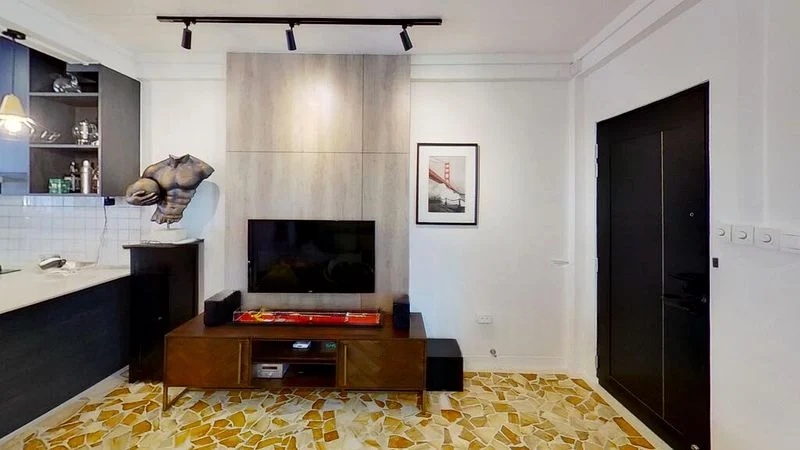 Step into a world of eclectic modern elegance as you enter this beautifully renovated HDB flat. The abundant natural light floods through large windows, illuminating the stunning yellow stone mosaic flooring and the unique floral wallpaper feature walls. With an open-concept layout, the living room seamlessly flows into the dining area, creating a warm and inviting ambiance perfect for both relaxation and entertaining.