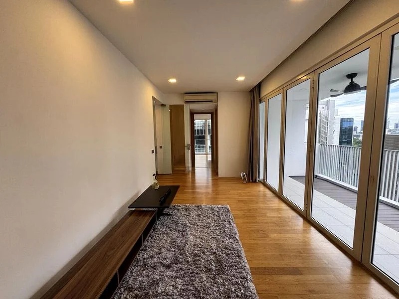 Step into a sanctuary of light and space at The Peak @ Cairnhill II, where abundant natural light floods through floor-to-ceiling glass doors, illuminating the open-concept living and dining area. The ambiance is bright and airy, enhanced by elegant wooden flooring and recessed ceiling lights, creating a welcoming atmosphere that invites relaxation and entertainment.