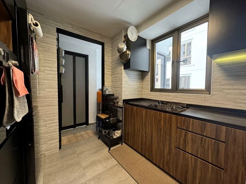 The well-planned layout features an L-shaped kitchen equipped with wood-grain and black cabinetry, a built-in oven, and a stylish tiled backsplash, perfect for culinary enthusiasts. The master bedroom offers a serene retreat, while the second bedroom is versatile enough for a home office or nursery. Additional highlights include a compact powder room and a service yard for laundry needs, ensuring practicality without compromising on style.
