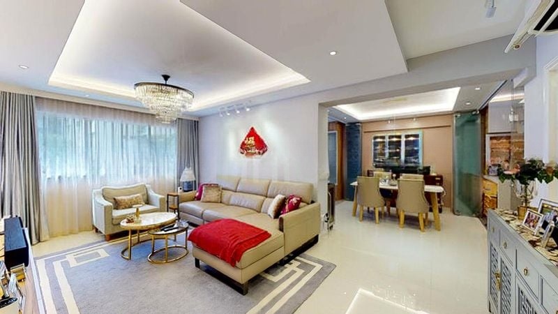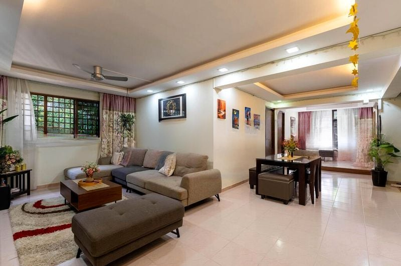 Step into a world of character as you enter this spacious HDB flat at 51 Sims Dr. The classic terrazzo flooring greets you, reflecting a sense of nostalgia while the original louvered windows invite moderate natural light, creating a warm and lived-in ambiance. The large living room offers ample space for multiple seating areas, perfect for family gatherings or quiet evenings.