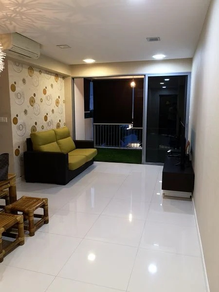 Step into this inviting 3-bedroom HDB flat, where the glossy white floor tiles and patterned wallpaper create a warm ambiance that instantly feels like home. The living room is bathed in natural light, thanks to sliding glass doors that open to a charming artificial turf balcony, perfect for enjoying the city views and relaxing evenings.