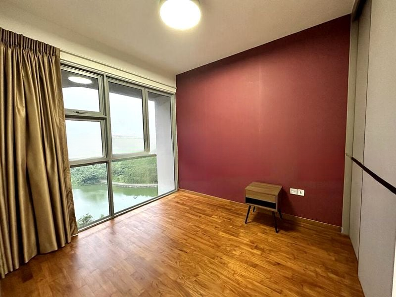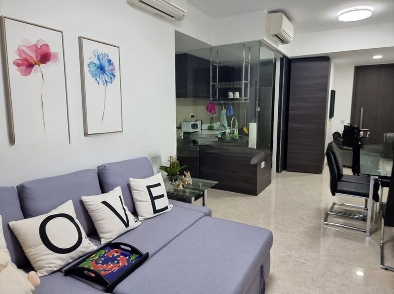 Step into a sanctuary of modern minimalism at Rivertrees Residences, where abundant natural light floods the space, accentuating the polished stone flooring and sleek finishes. The floor-to-ceiling sliding glass doors invite you to a private balcony, offering serene views of lush greenery and the urban landscape beyond, creating a perfect blend of tranquility and vibrancy.