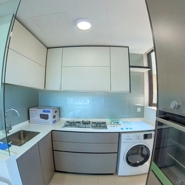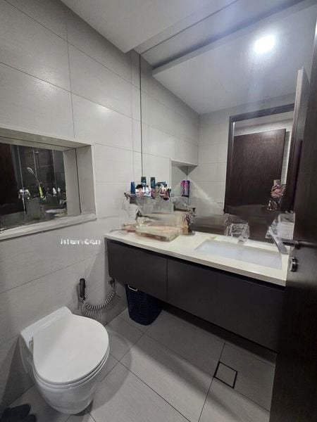 This well-maintained 3-bedroom unit boasts standout features including a stylish breakfast bar, a fully-equipped kitchen with a gas cooktop and integrated washing machine, and a custom platform bed with built-in storage. The bathrooms are elegantly designed with dark wood cabinets and large mirrors, while the polished tile and dark wood-look flooring throughout add a touch of sophistication.