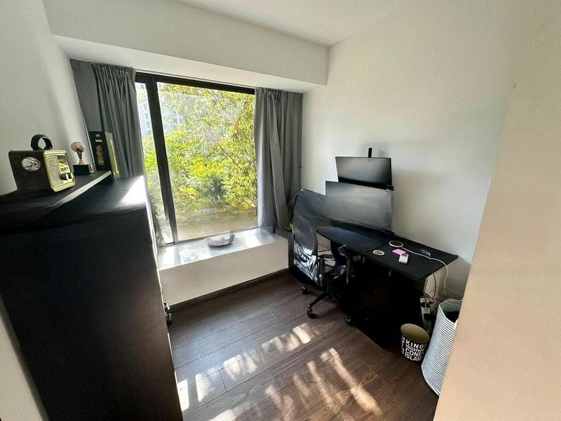 This well-maintained unit boasts a thoughtfully designed layout, featuring an L-shaped kitchen with two-tone cabinetry and integrated gas hob, perfect for culinary enthusiasts. The walk-in wardrobe offers ample storage, while the built-in window bench in the second bedroom invites relaxation. The mask gallery wall in the hallway adds an artistic flair, complemented by track lighting that highlights its beauty.