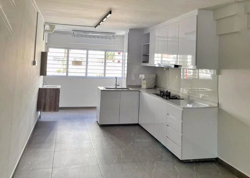 Step into this beautifully renovated HDB flat and be greeted by an abundance of natural light that dances across the open-concept living area. The modern minimalist design features light wood-look vinyl flooring and sleek white high-gloss cabinetry, creating a fresh and inviting ambiance. Enjoy urban views through large windows, complemented by stylish black ceiling fans and a chic grey floating TV console that adds a touch of elegance.