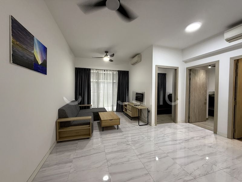 This efficient 2-bedroom plus study layout features an open-concept kitchen adorned with white quartz countertops and dual-tone cabinetry, seamlessly flowing into the living area. The fully-furnished space includes an L-shaped grey sofa, integrated appliances, and a dedicated balcony, perfect for relaxation. The bathroom showcases elegant marble-look wall tiles and a rain shower, adding a touch of luxury to your daily routine.
