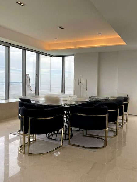 Step into a world of modern luxury as you enter this exquisite unit at Silversea. The abundant natural light floods through the floor-to-ceiling glass walls, showcasing breathtaking panoramic sea views that stretch to the horizon. With a double-volume ceiling in the living area, the ambiance is both airy and inviting, enhanced by elegant marble flooring and stylish spherical pendant lighting.