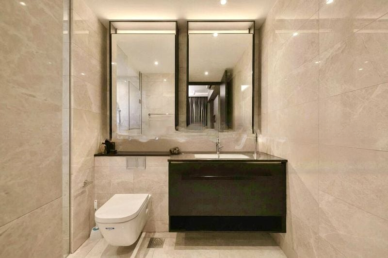 The efficient layout features a dedicated foyer leading into a seamless flow between the living and dining spaces. The kitchen boasts minimalist white cabinetry, integrated appliances, and a breakfast bar perfect for casual dining. The master bedroom offers a tranquil retreat with built-in wardrobes that include under-cabinet LED lighting, while the bathrooms are a sanctuary with floating vanities and luxurious rain showers, all adorned with marble-look finishes.