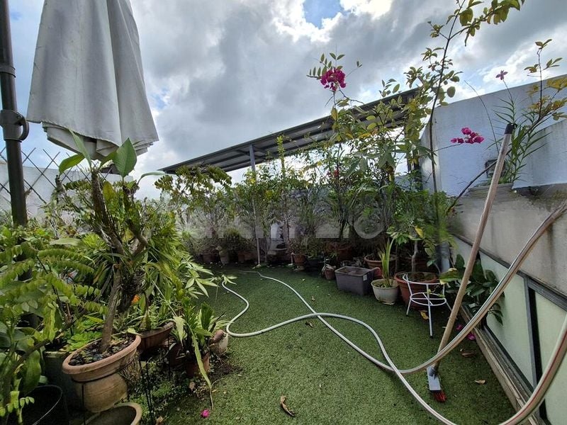 This spacious 1,690 sqft unit boasts a well-thought-out layout with three generous bedrooms and two modern bathrooms. The open-concept design integrates the living and dining areas, highlighted by a bar-height wooden table and a fully-equipped kitchen with built-in full-height cabinetry. The highlight is undoubtedly the expansive roof terrace adorned with artificial turf, perfect for hosting gatherings or enjoying quiet evenings surrounded by potted plants.
