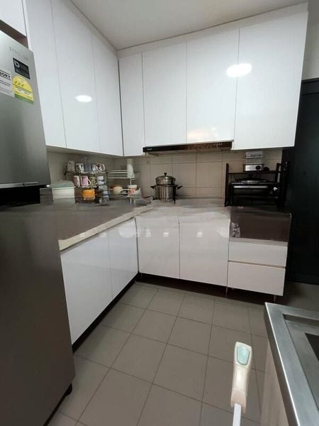 Step into this well-maintained 3-bedroom flat and be greeted by stunning views of the city skyline and lush greenery. The natural light flows through large windows, enhancing the functional and compact ambiance of the space. The open-concept kitchen, featuring a striking blue backlit island, invites culinary creativity while seamlessly connecting to the living area, perfect for entertaining.