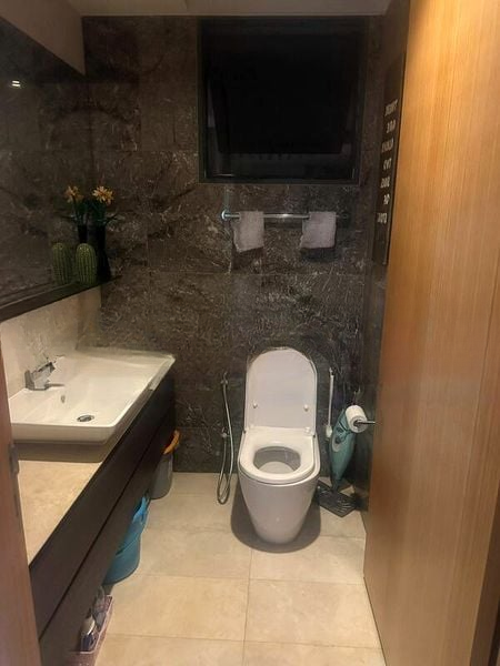 This well-maintained unit features a thoughtful layout with two spacious bedrooms, each adorned with bay windows that enhance the living space. The modern kitchen, equipped with minimalist white cabinetry and a black refrigerator, seamlessly connects to the dining area, while the bathrooms boast elegant marble-patterned wall tiles and a floating vanity for a touch of luxury. The efficient design includes a household shelter for added storage, ensuring functionality without compromising style.