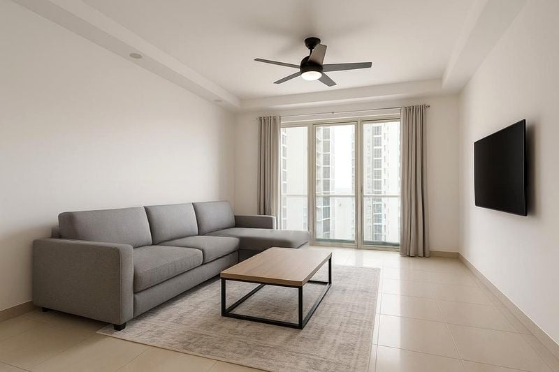 Step into a haven of modern comfort where a brick-textured feature wall greets you, creating a warm and inviting ambiance. The living room, bathed in natural light, offers access to a balcony that overlooks lush greenery and neighboring buildings, perfect for unwinding after a long day. The cozy yet contemporary design is complemented by a spacious dining area featuring built-in bench seating and designer pendant lights, making it an ideal space for family gatherings.