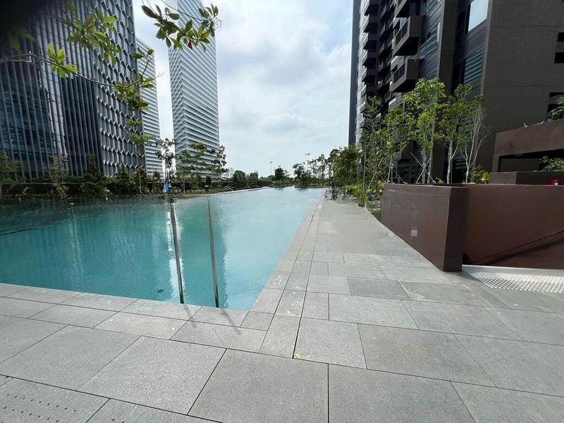 Step into a sanctuary of modern minimalist design where abundant natural light floods the space, accentuating the sleek finishes and inviting ambiance. The unobstructed views of the pool and city skyline from the glass-railed balcony create a serene backdrop, making every moment spent here feel like a retreat.