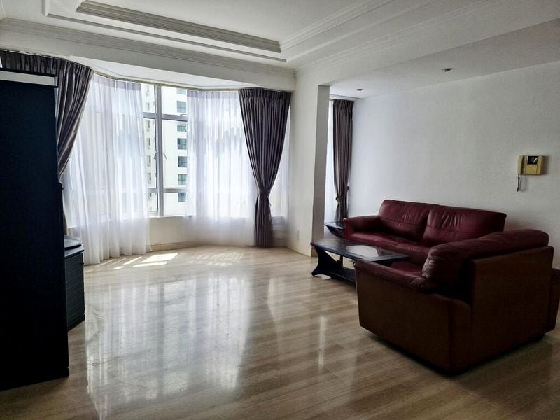 Step into a bright and airy sanctuary at Euro-Asia Court, where abundant natural light floods the space, highlighting the elegant bay window in the living room. The chic chandelier and modern finishes create an inviting ambiance, while large windows frame breathtaking views of the city skyline, making every moment spent here feel special.