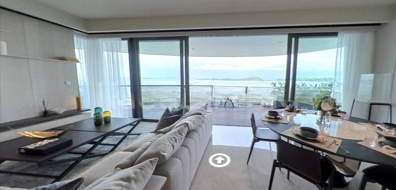 Step into a world of elegance and tranquility as you enter this brand-new designer unit at Cape Royale. The abundant natural light floods the open-concept living area, highlighting the polished stone flooring and creating a bright, airy ambiance. Floor-to-ceiling glass sliding doors lead you to a stunning curved balcony, where panoramic sea views stretch across the horizon, inviting you to unwind in this serene setting.