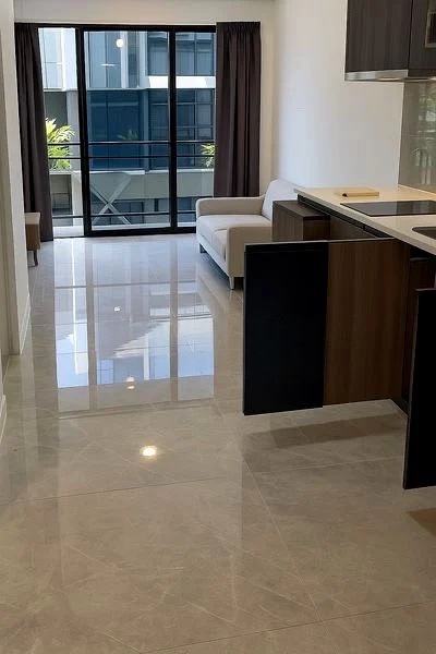 Step into a sanctuary of modern elegance, where abundant natural light floods the open-concept living space through floor-to-ceiling sliding glass doors. The polished marble-look floor tiles and sleek finishes create a sophisticated ambiance, while the captivating views of the lap pool and lush greenery invite a sense of tranquility.