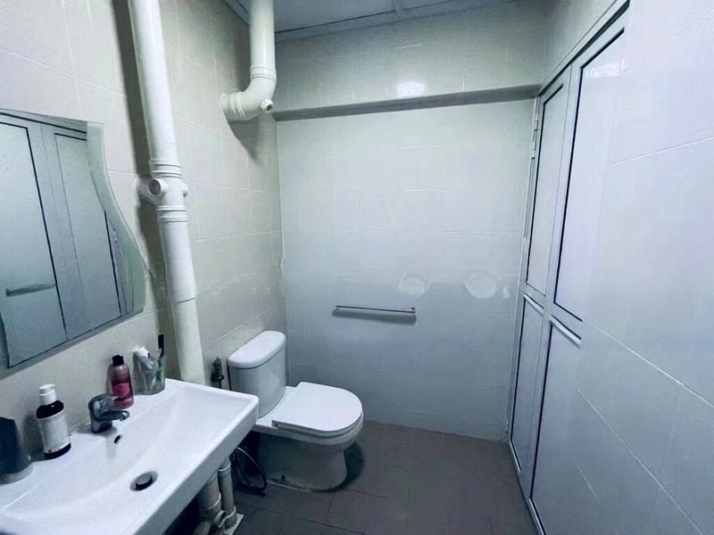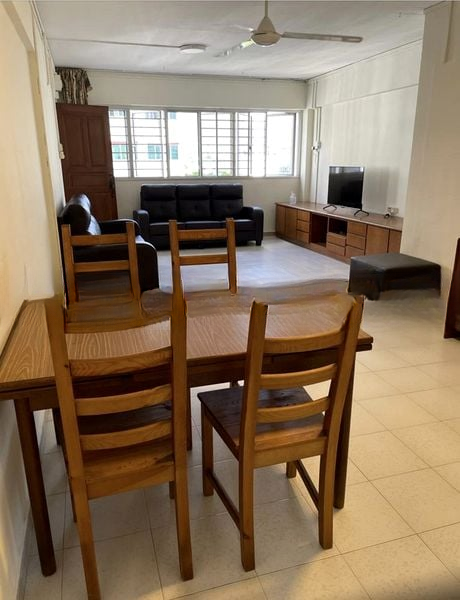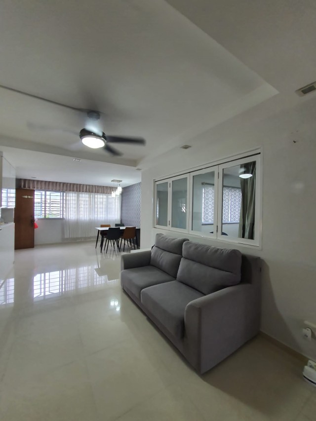 Step into this beautifully renovated HDB flat and be greeted by a sense of modern elegance. The open-concept living area, adorned with light-colored polished floor tiles and a ceiling fan with integrated light, invites natural light to dance across the space. The geometric feature wallpaper and designer pendant lighting create a sophisticated ambiance, while the extensive built-in storage cabinets ensure functionality without compromising style.