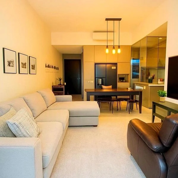 This well-maintained 2-bedroom, 2-bathroom unit features a spacious living room with built-in shelving, perfect for showcasing your personal style. The open-concept kitchen is equipped with integrated appliances, including an oven and induction hob, complemented by sleek grey cabinetry and white countertops. The bathrooms boast elegant marble-look wall tiles and modern vanities, ensuring a touch of luxury in your daily routine.