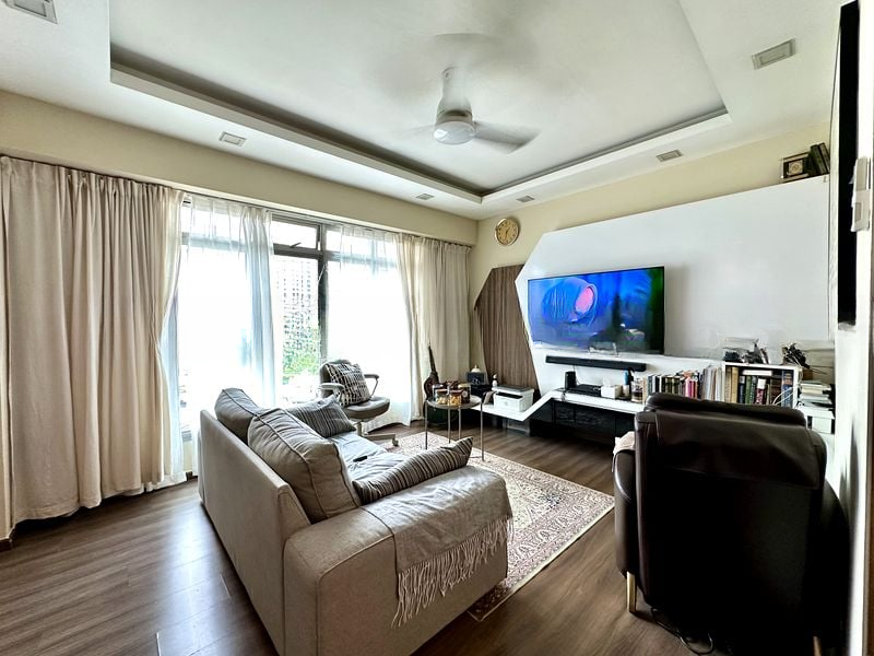 Step into a cozy haven at 633B Senja Rd, where abundant natural light pours through large windows, illuminating the warm wooden flooring and modern finishes. The inviting ambiance is enhanced by a false ceiling with cove lighting, creating a perfect backdrop for relaxation and entertaining. Enjoy urban views from the comfort of your living room, complemented by a built-in feature wall that adds character to the space.