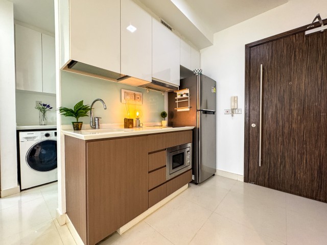 Step into this beautifully maintained dual-key unit at Kensington Square, where modern minimalist design meets serene greenery views. The polished tile flooring and dark wood entry doors create an inviting foyer, while the living area, bathed in natural light, features a sliding glass door that seamlessly connects to the balcony, enhancing the sense of space and tranquility.