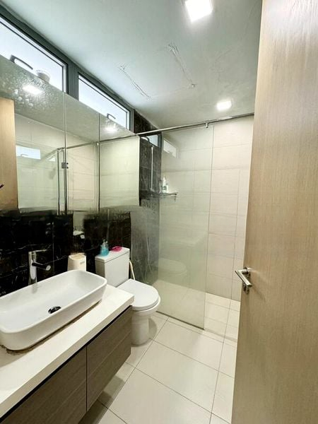 This well-designed 3-bedroom, 3-bathroom unit features a galley kitchen equipped with a gas hob, built-in oven, and sleek white countertops, ideal for culinary enthusiasts. The bedrooms are generously sized with wood flooring and track lighting, providing a cozy retreat. The bathrooms are tastefully finished with tiled walls and a modern vanity, ensuring comfort and style throughout.