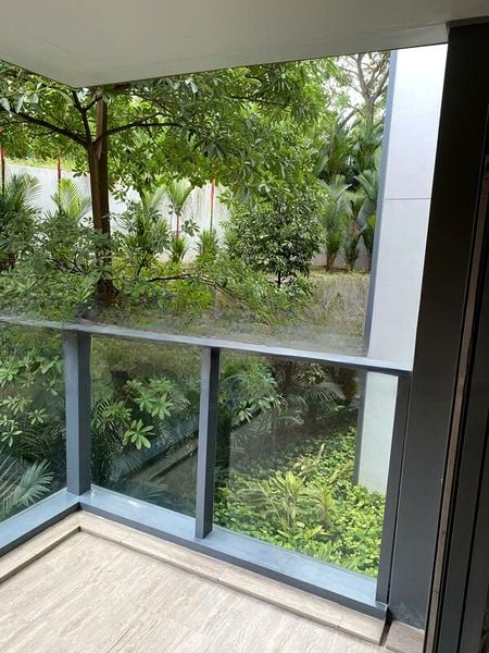 Step into a serene oasis at SOPHIA HILLS, where abundant natural light floods the space through floor-to-ceiling windows, offering stunning views of lush greenery. The modern minimalist design is accentuated by high-quality finishes, including wood flooring and a glass balcony railing that invites you to unwind in style.