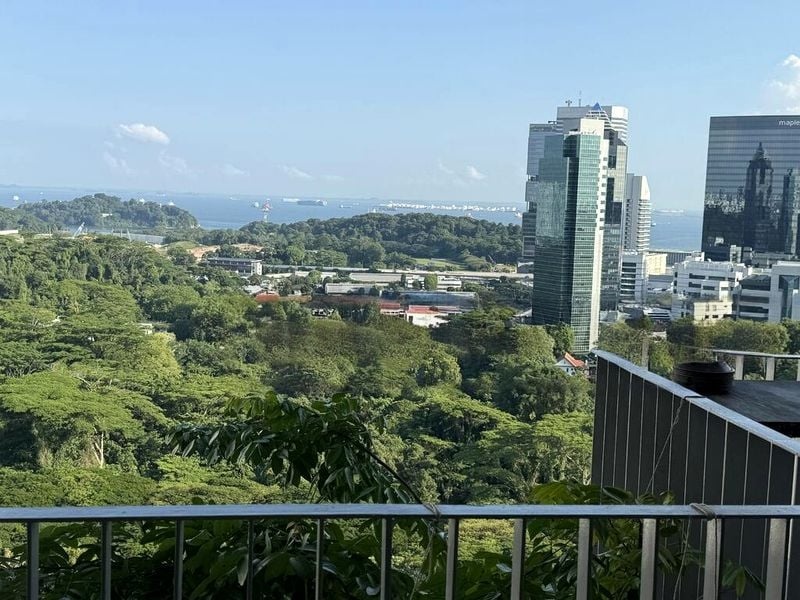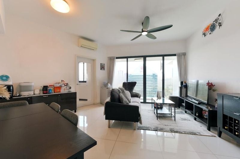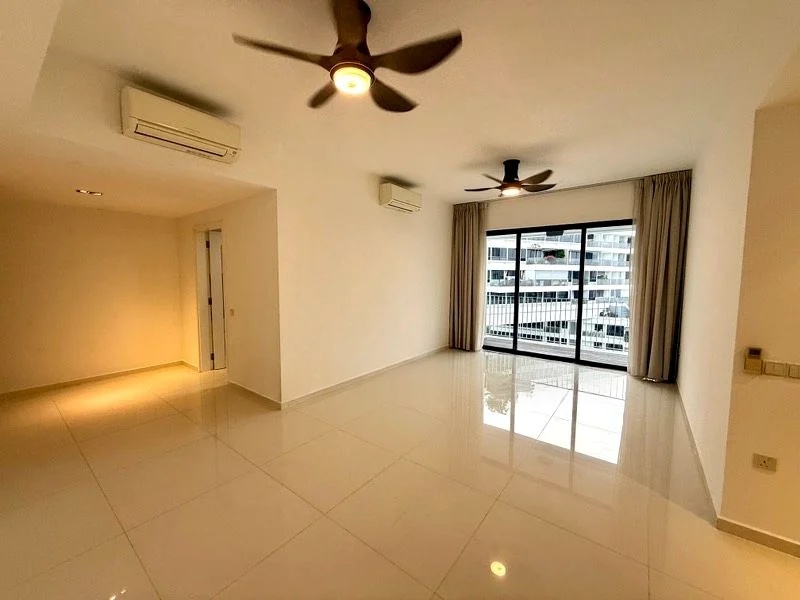 Step into a bright and airy sanctuary where abundant natural light floods through floor-to-ceiling windows, framing iconic views of The Interlace and the shimmering swimming pool below. The inviting ambiance, complemented by lush greenery and glimpses of the city skyline, creates an immediate sense of tranquility and luxury.