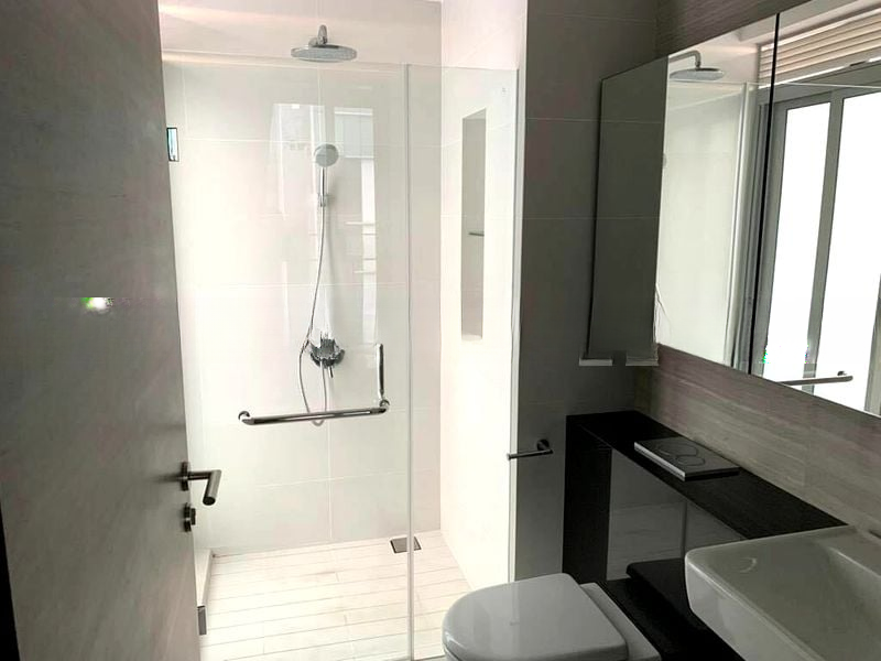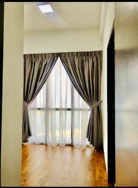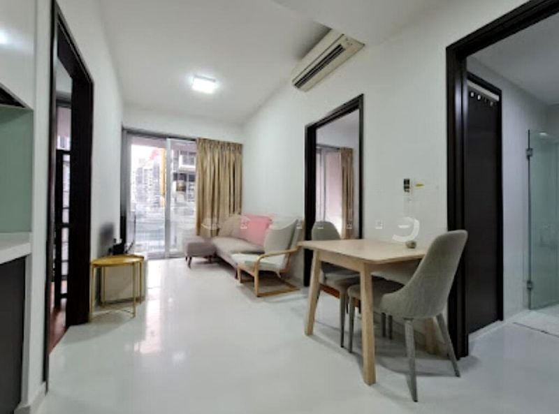 Step into a bright and airy sanctuary at EON SHENTON, where abundant natural light floods the open-concept living area, accentuating the sleek white tiled flooring and inviting ambiance. The sliding door leads you to a private balcony, offering captivating views of the city skyline, perfect for unwinding after a long day.