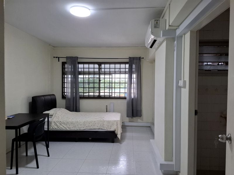This studio features a cozy bedroom equipped with a wooden wardrobe and air conditioning, ensuring comfort throughout the day. The kitchenette is practical, complete with a white refrigerator and a small dining area, perfect for intimate meals. An en-suite bathroom offers convenience, while the indoor laundry area with a ceiling-mounted drying rack adds to the unit's functionality.