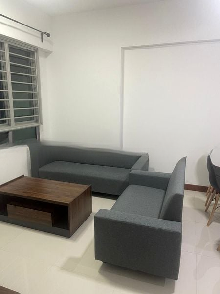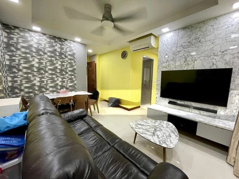 Step into a beautifully renovated HDB flat that exudes a modern and cozy ambiance. The open-concept kitchen seamlessly integrates with the dining area, featuring dark cabinetry and designer pendant lights that create a warm glow. Enjoy unblocked views of the city skyline and lush greenery from the high floor, filling the space with natural light and a sense of tranquility.