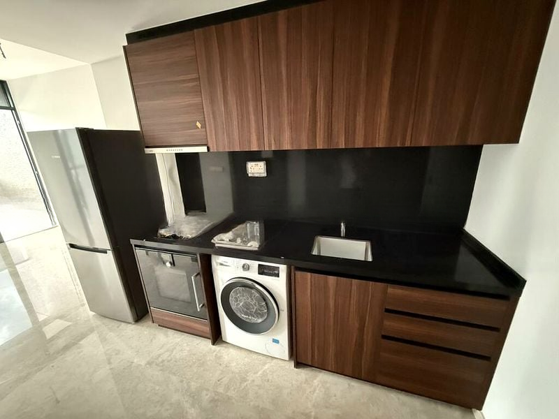 This thoughtfully designed 1-bedroom unit features an open-concept living area seamlessly connected to a linear kitchenette, equipped with premium black stone countertops and Bosch appliances. The bathroom boasts a wall-hung toilet and a floating vanity, complemented by natural ventilation and stone wall cladding. The bedroom, adorned with dark wood parquet flooring, includes a built-in sliding wardrobe for ample storage.