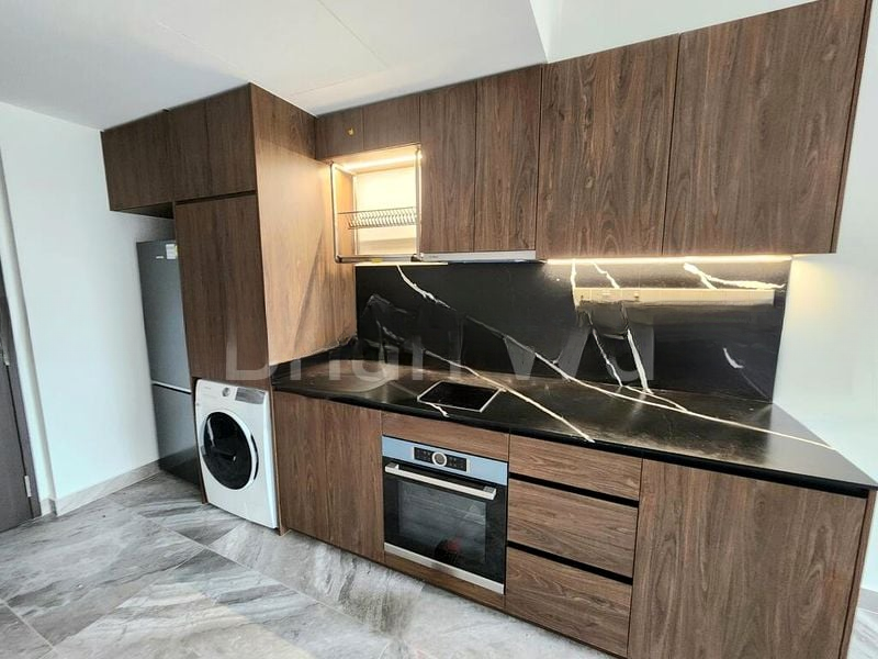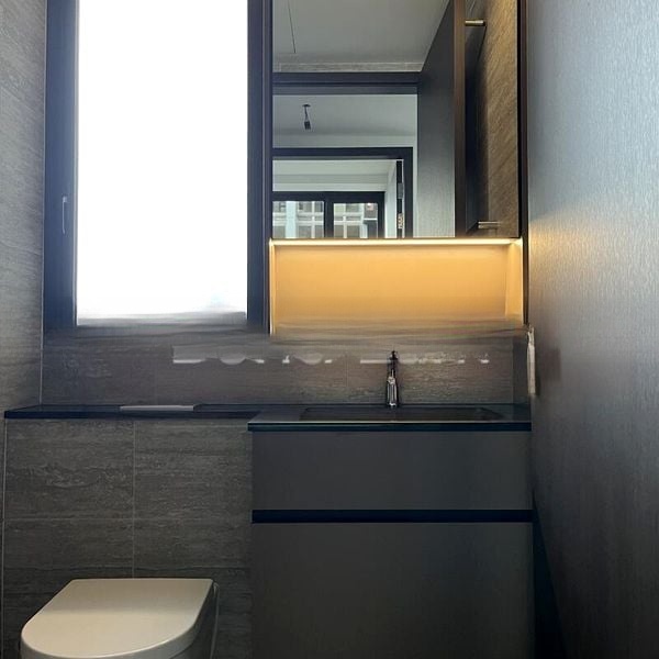 This 1-bedroom unit features a thoughtfully designed layout with standout elements, including dark wood cabinetry, integrated kitchen appliances, and a luxurious walk-in shower with a glass partition in the bathroom. The wall-hung toilet and large vanity mirror with integrated lighting add a touch of modern convenience. With partial furnishing included, this space is ready for you to make it your own.