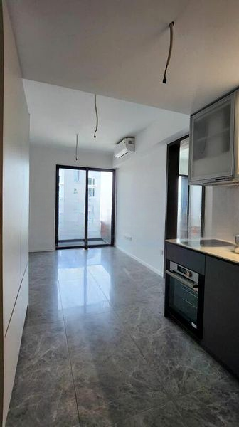 This 1-bedroom unit features a well-thought-out layout with an en-suite bathroom showcasing full-height marble-look tiling, a luxurious rain shower, and a contemporary vanity. The kitchenette is equipped with an integrated oven and dark cabinetry, seamlessly blending style and functionality. With built-in frosted glass wardrobes and exposed ceiling wiring for light fixtures, every detail has been meticulously designed for modern living.