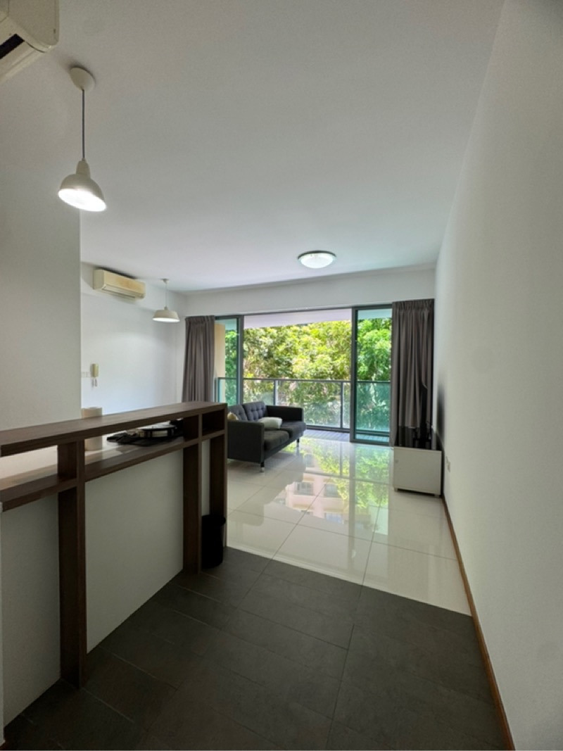 Step into this inviting 2-bedroom unit at Double Bay Residences, where abundant natural light floods the space through large floor-to-ceiling glass sliding doors. The bright and airy ambiance is complemented by a stunning balcony featuring dark timber decking, offering serene views of lush greenery and neighboring residential buildings, creating a peaceful retreat right at home.