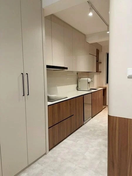 Step into a beautifully maintained HDB flat that exudes modern minimalist charm. The moment you enter, you are greeted by the stunning Palladiana stone fragment flooring that flows seamlessly through the living room, complemented by a large wall of louvered windows that bathe the space in natural light. The ambiance is both inviting and sophisticated, enhanced by designer lighting and a tasteful selection of furnishings.