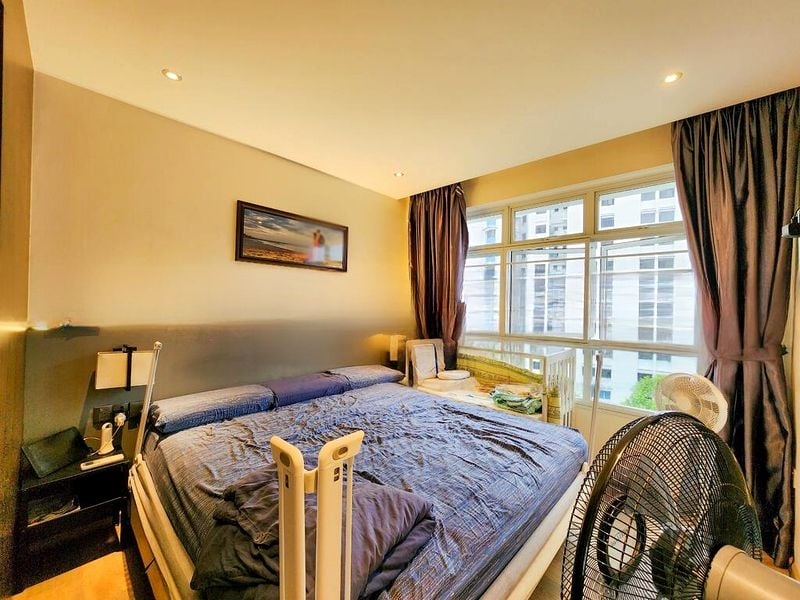 This well-maintained unit features a thoughtful layout with three bedrooms, including a master bedroom with wood-look laminate flooring and a built-in wardrobe. The galley kitchen boasts a stylish marble-look backsplash and integrated laundry drying rack, while the dining area showcases a striking wooden slat feature wall and a 6-seater dining set, ideal for family gatherings.