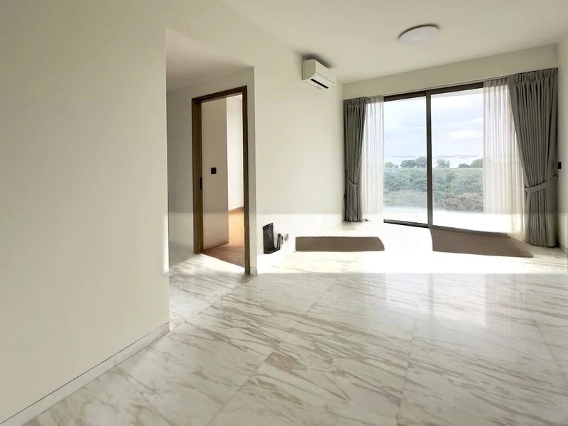 Step into a world of elegance as you enter this brand-new unit at Coastline Residences. The abundant natural light floods the space, highlighting the exquisite marble-look floor tiles and the airy ambiance that invites relaxation. Large sliding glass doors open to a balcony, offering serene views of lush greenery and the distant water, creating a perfect backdrop for your daily life.