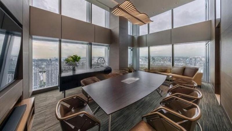 Step into a world of modern luxury where abundant natural light floods through floor-to-ceiling windows, showcasing breathtaking panoramic views of the city skyline and harbor. The designer finishes, including marble-patterned flooring and textured feature walls with integrated backlighting, create an ambiance that is both sophisticated and inviting.