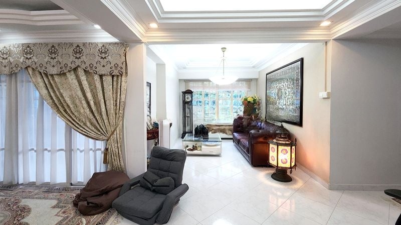 Step into a world of warmth and elegance as you enter this beautifully renovated 3-bedroom flat. The abundant natural light floods the spacious open-plan living and dining areas, highlighting the exquisite marble-look tile flooring and the multi-tiered false ceiling adorned with cove lighting. Large windows draped with ornate valance and sheer curtains frame picturesque views of lush greenery, creating a cozy ambiance that invites relaxation.