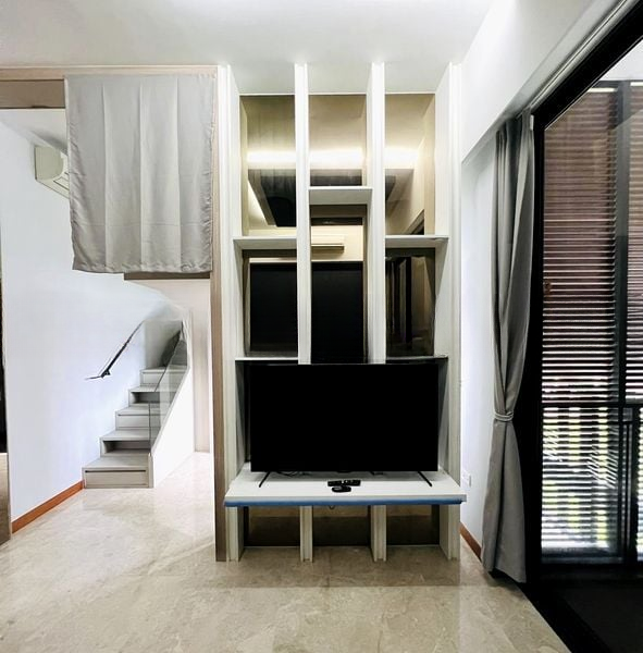 Step into a world of modern elegance as you enter this beautifully designed studio unit at The Hillier. Bathed in abundant natural light, the high ceilings and floor-to-ceiling windows create an airy ambiance, while the sleek black glossy floor tiles and custom white shelving unit add a touch of sophistication. Enjoy picturesque views of the pool and lush greenery, making every moment spent here a serene escape from the urban hustle.
