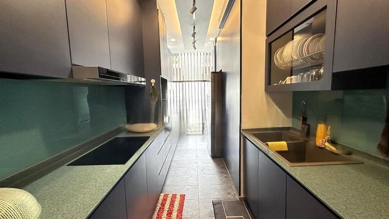 Step into a bright and airy sanctuary where abundant natural light floods the space through floor-to-ceiling glass doors. The modern black and white facade complements the lush greenery and pool views, creating a serene atmosphere that invites relaxation. The expansive full-length balcony serves as an outdoor living space, perfect for enjoying the tranquil surroundings of this low-rise neighborhood.