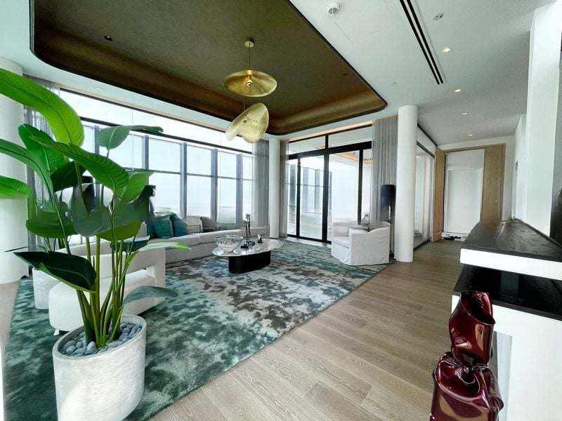 Step into a world of sophistication as you enter this exquisite unit at The Ritz-Carlton Residences. Bathed in abundant natural light, the living area boasts floor-to-ceiling windows that frame breathtaking views of the city skyline and lush greenery. The ambiance is elevated by designer chandeliers and luxurious finishes, creating a warm yet opulent atmosphere that invites you to unwind.