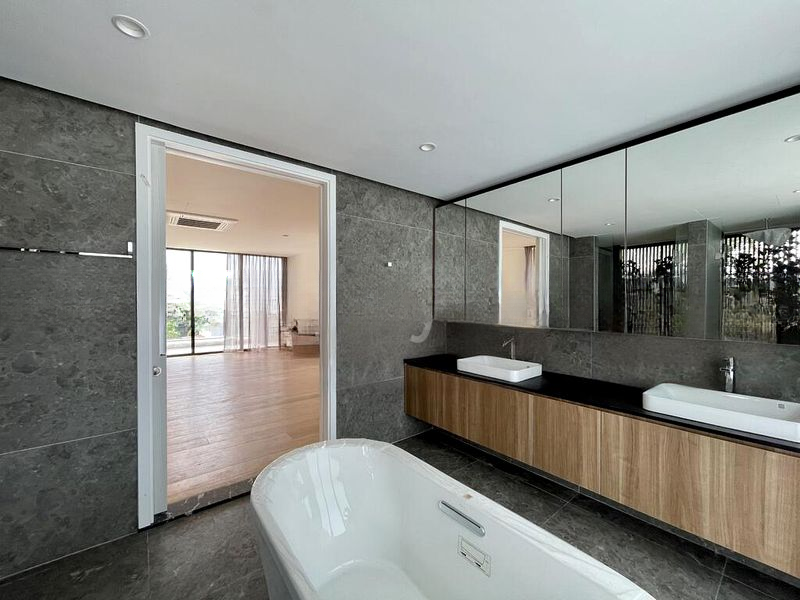 This spacious 5-bedroom, 5-bathroom residence boasts standout features including a freestanding bathtub, double vanity with vessel sinks, and a modern kitchen equipped with integrated stainless steel appliances. The layout emphasizes indoor-outdoor living, with each room designed to maximize comfort and style. Enjoy the luxury of designer finishes throughout, from the marble-look wall and floor tiles to the warm wood flooring in the bedrooms, all contributing to a sophisticated yet inviting atmosphere.