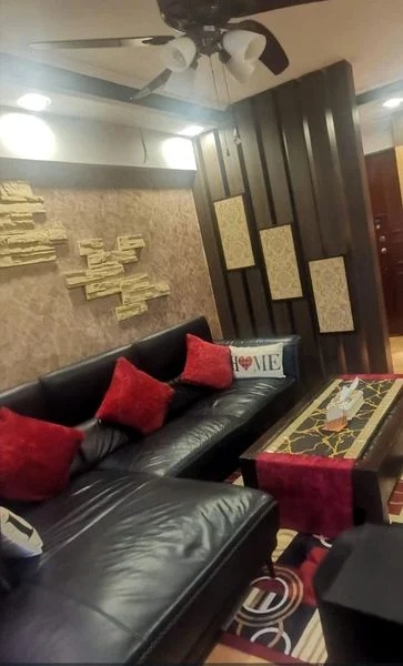 Step into a warm and inviting space where custom dark wood cabinetry meets modern elegance. The cozy ambiance envelops you as natural light filters through, highlighting the textured feature walls and cove lighting that create a serene atmosphere. The thoughtfully designed layout flows seamlessly from the living room, adorned with an L-shaped leather sofa, to the dining area featuring a stylish 4-seater set and a large ornate mirror.