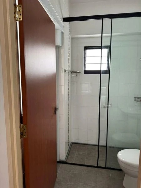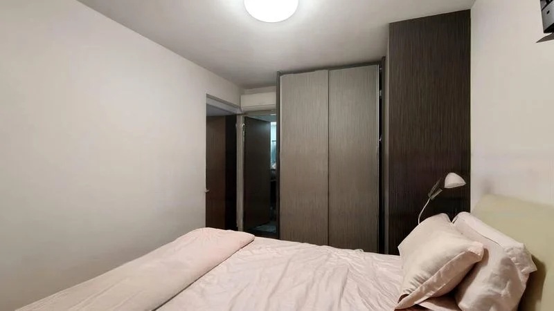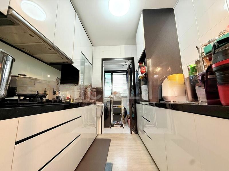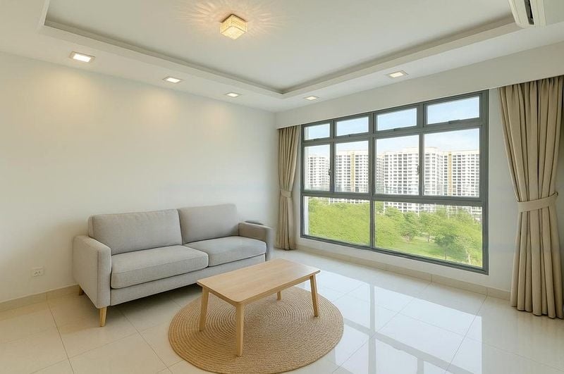 Step into a bright and airy sanctuary where abundant natural light floods the spacious open-concept living and dining area, accentuated by glossy floor tiles and large windows adorned with patterned sheer curtains. The ambiance is inviting, with a refreshing view of greenery that enhances the tranquil atmosphere of this well-maintained unit.