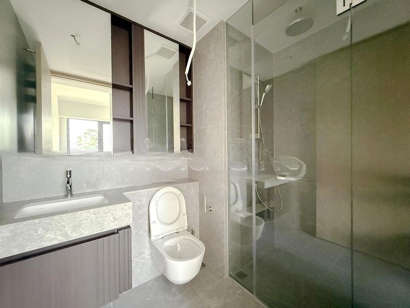 Step into a world of luxury as you enter this brand-new designer unit at KI Residences at Brookvale. Bathed in abundant natural light, the modern dark facade is complemented by wood-toned balcony accents, creating a warm and inviting ambiance. Enjoy unblocked views of lush greenery, the city skyline, and a serene pool, all from the comfort of your home.